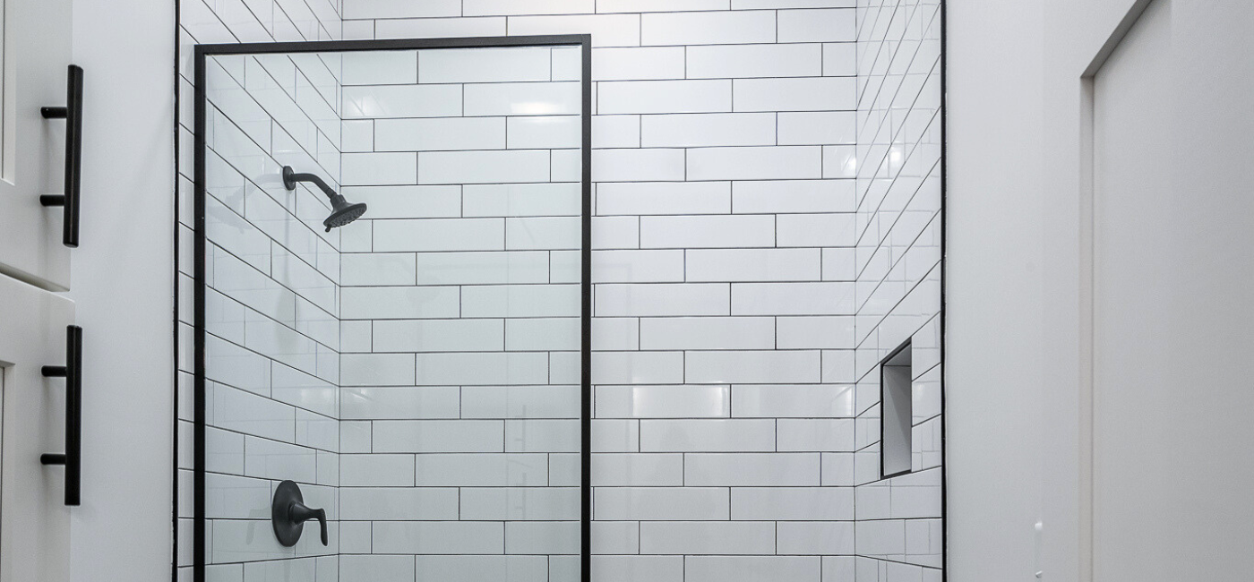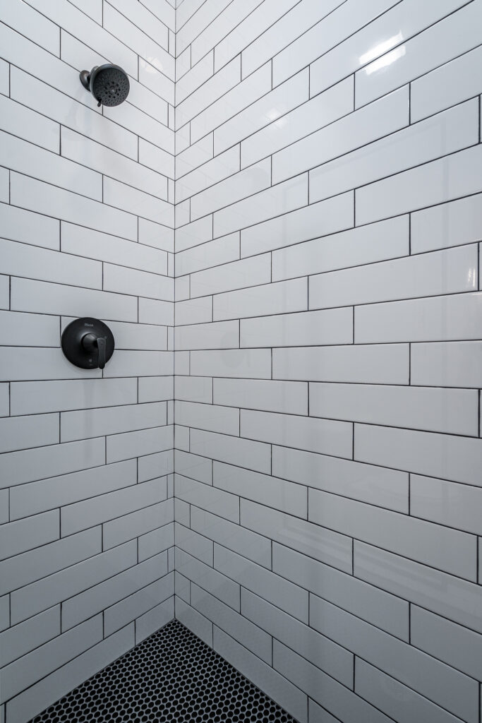 - Shower Floor & Niche: Speartek Buckhead Penny Mosaic in Matte Black