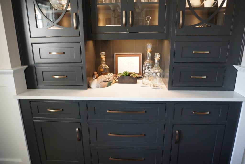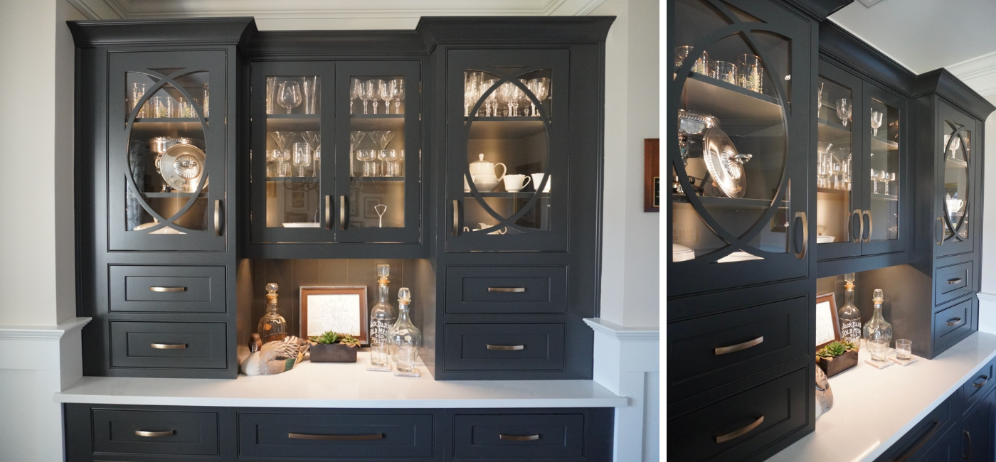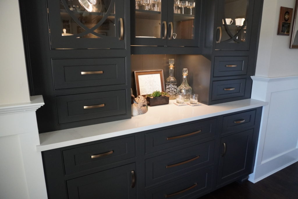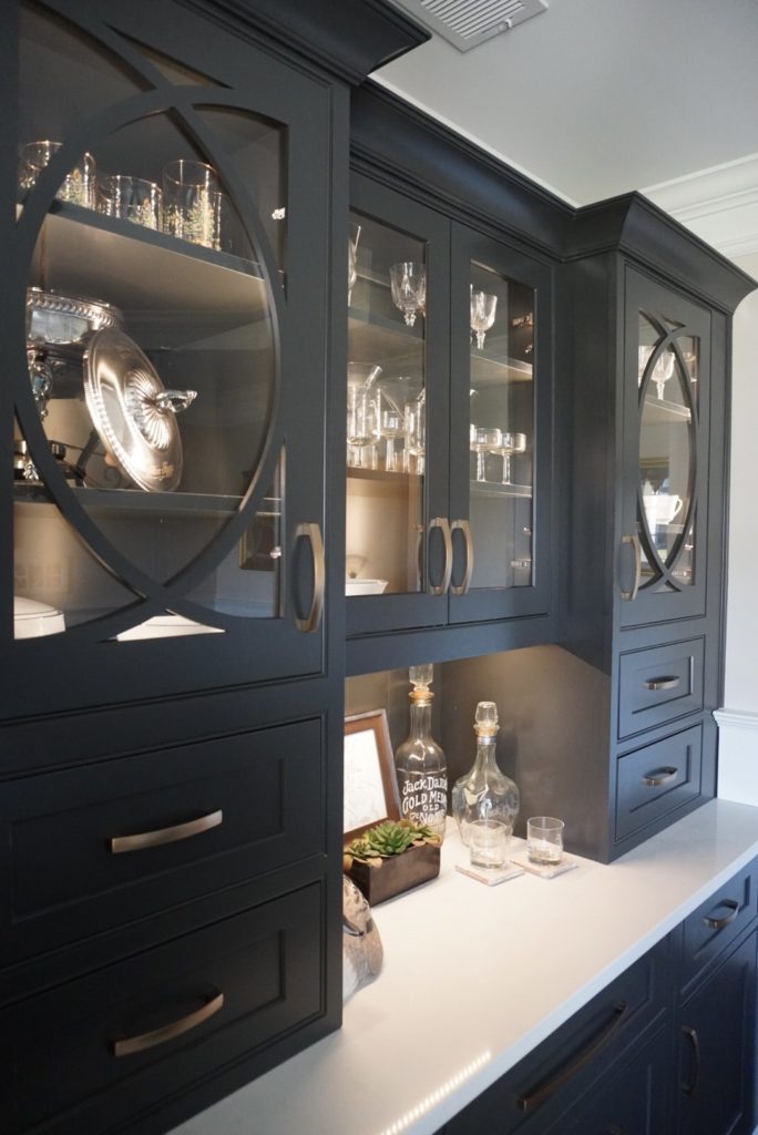 “This built-in bar was part of a larger kitchen remodel. I created a beautiful, custom, built-in hutch for displaying and storing barware that has functionality but is separate from the everyday hustle of the main kitchen. Keeping the traditional home style in mind, I introduced an updated, modern feel.”