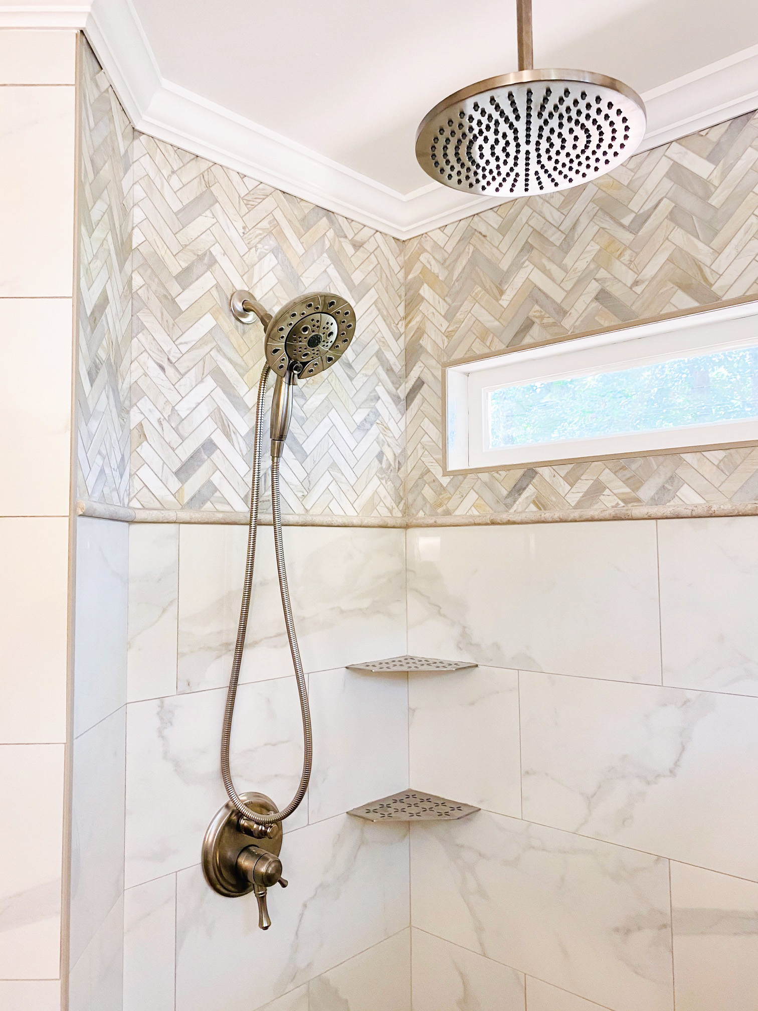 “The Fantasy Brown Marble on the bench top and vanity tops was so beautiful, it pulled together all of the silver marble tile, wood browns, and blue-greys from the wall paint.”