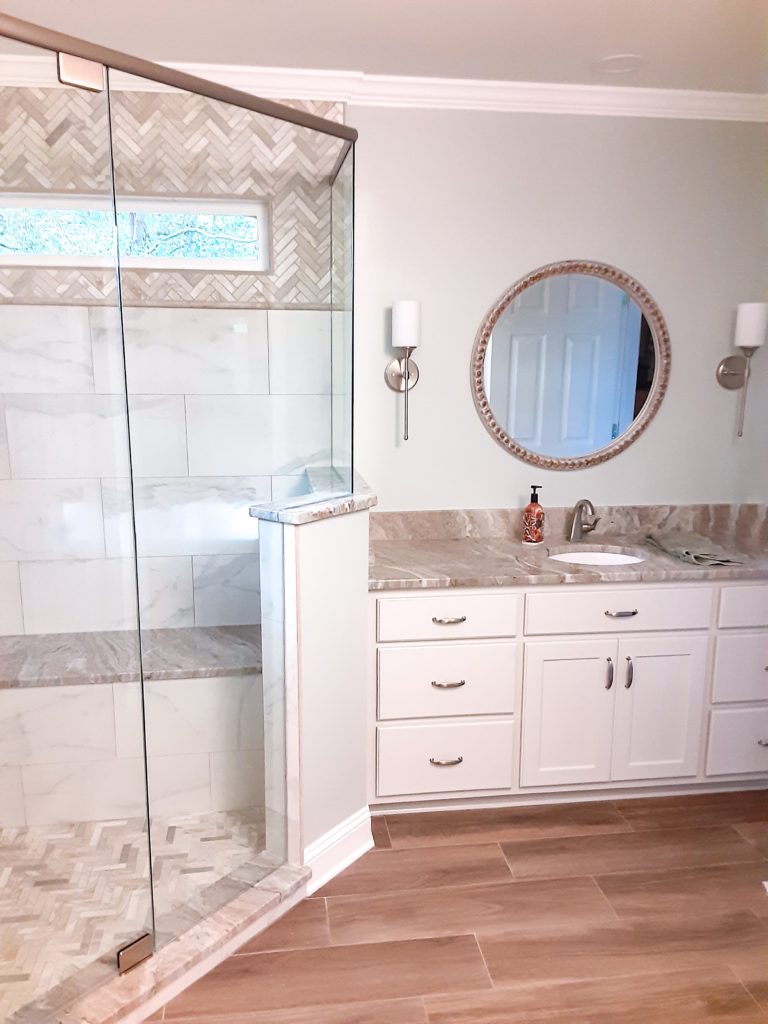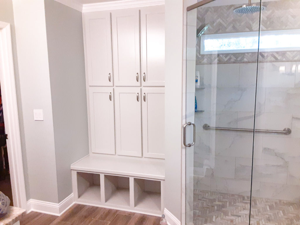 “The Fantasy Brown Marble on the bench top and vanity tops was so beautiful, it pulled together all of the silver marble tile, wood browns, and blue-greys from the wall paint.”