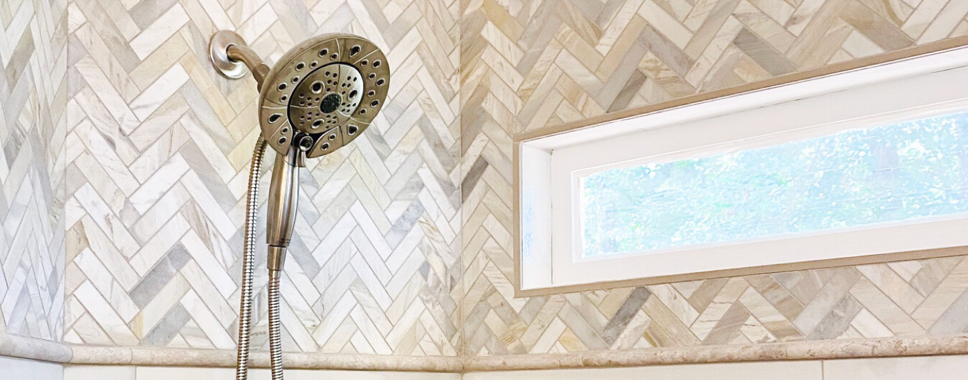 - Wall tile: Daltile Elect 1″ x 3″ Herringbone Mosaic