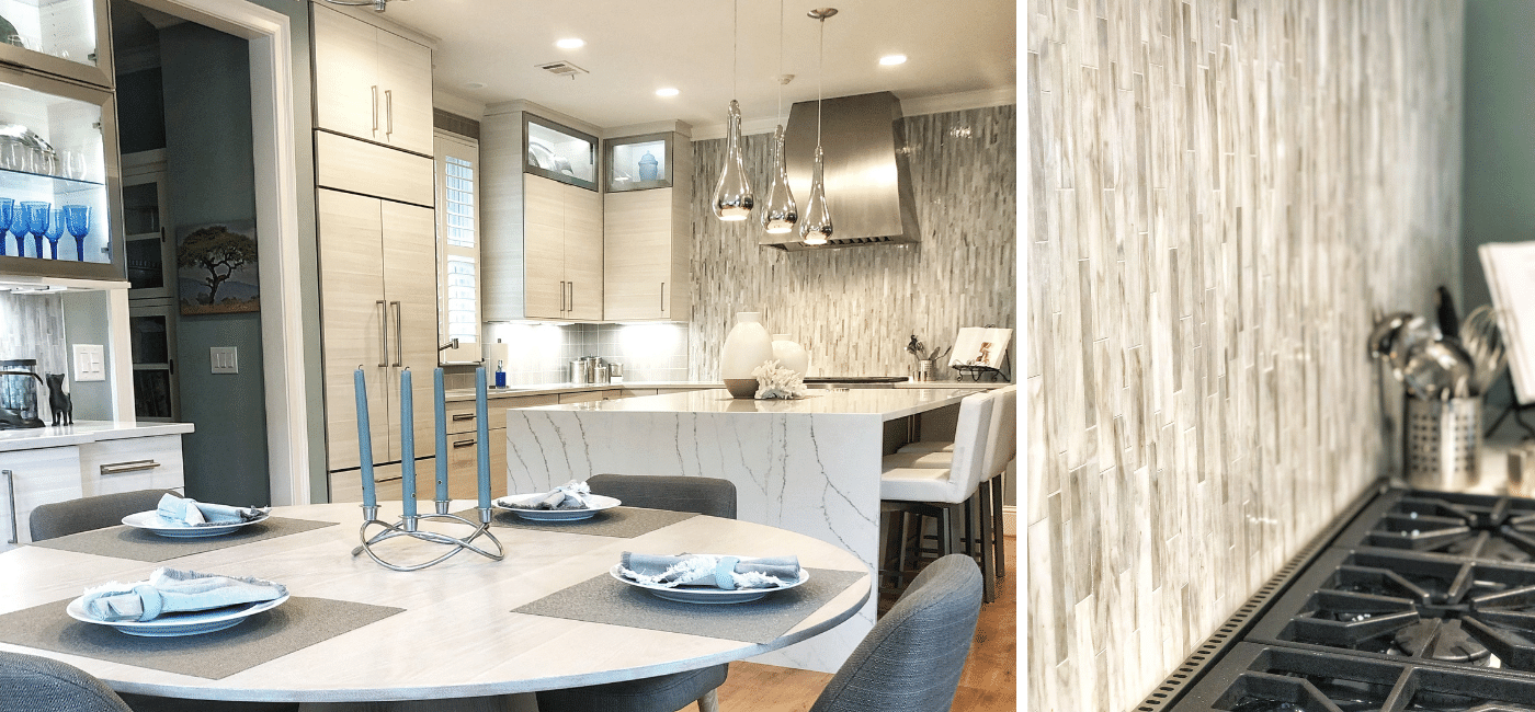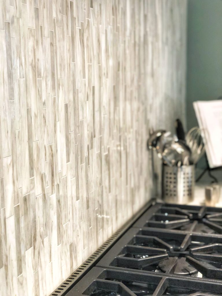 - Backsplash: Daltile Serenade Interlocking Linear Glass Mosaic