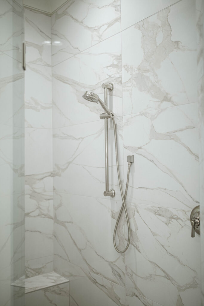 The client wanted to renovate her bathroom with a modern-transitional aesthetic, aiming to eliminate the travertine appearance and give the bathroom space a fresh, updated look.