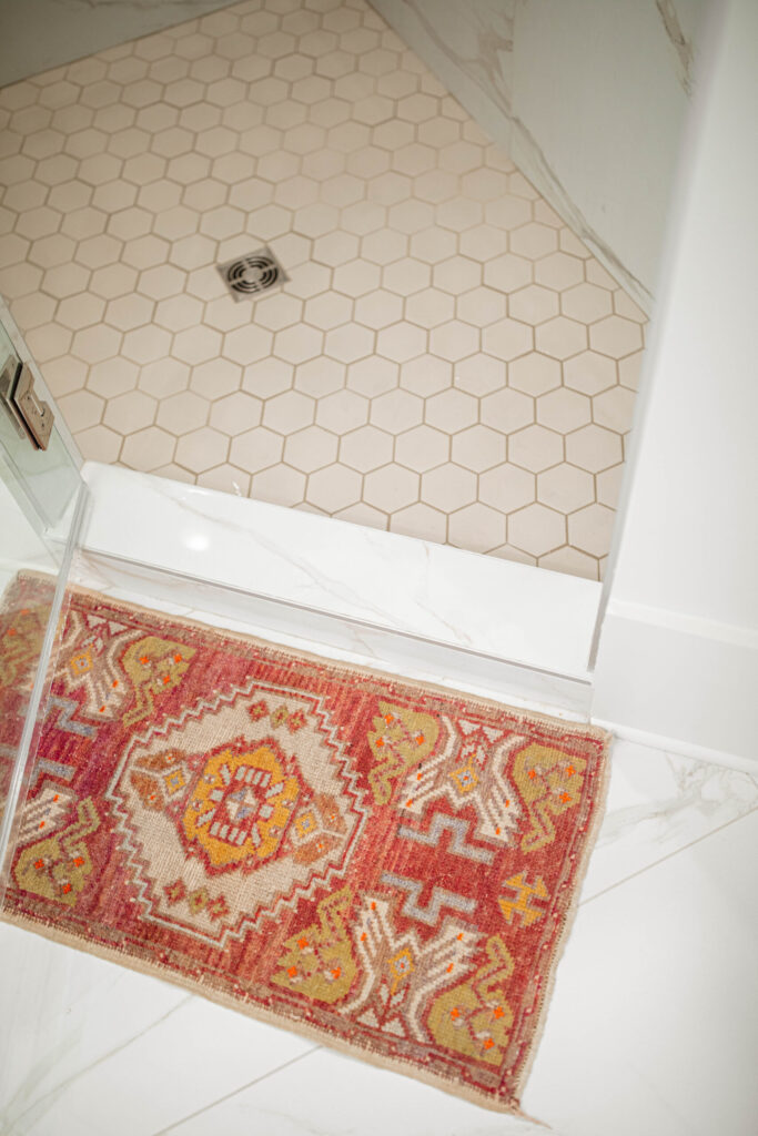 - Shower Floor Tile: Emser Source in Fawn – 3” Hexagon Mosaic