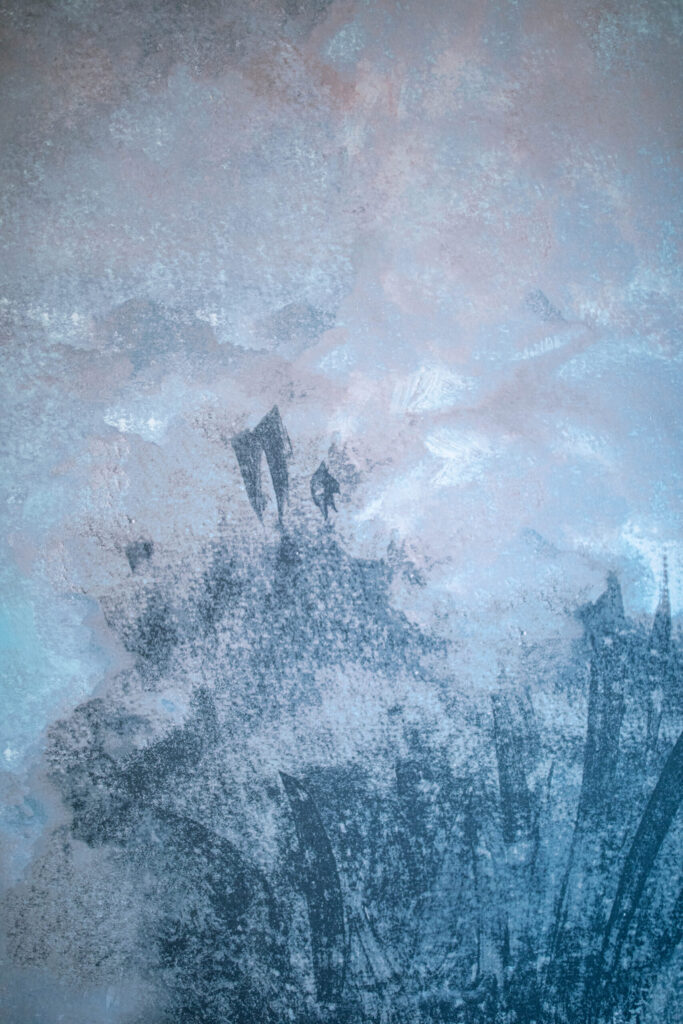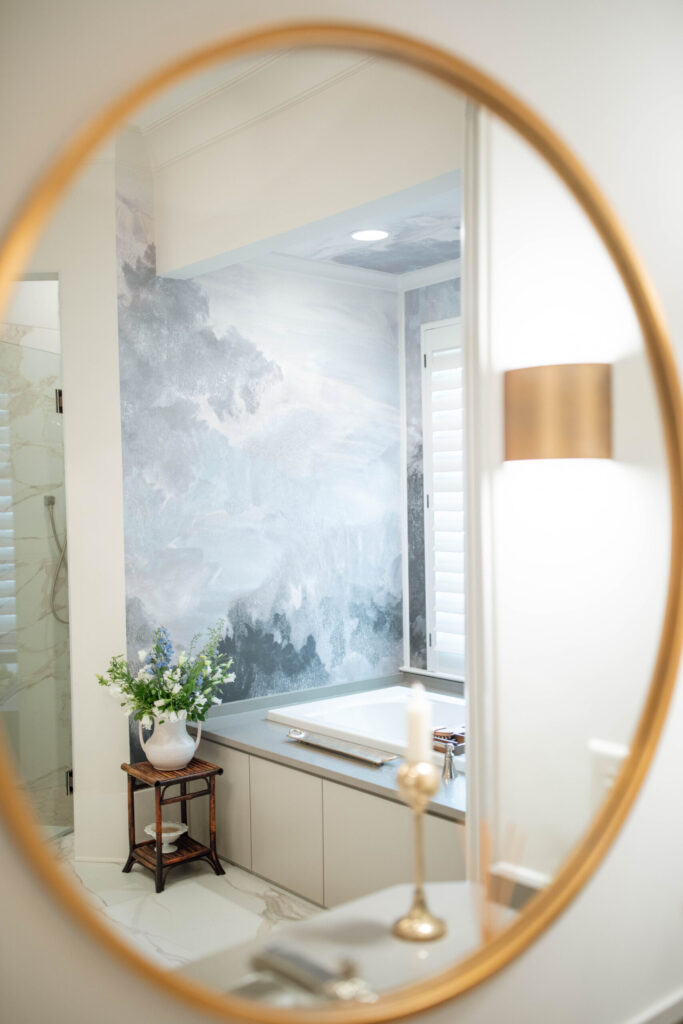 “The client was tired of the travertine tile look in her bathroom, and she fell in love with the Stratus tile when she came into our showroom at Lake Oconee. That tile has a lot of drama and pulls cools and warm tones, so we balanced out the color with the warm cabinets and cool quartz tops. The wallpaper mural gave me chills when I saw it because it had the perfect colors in it to pull everything together.”