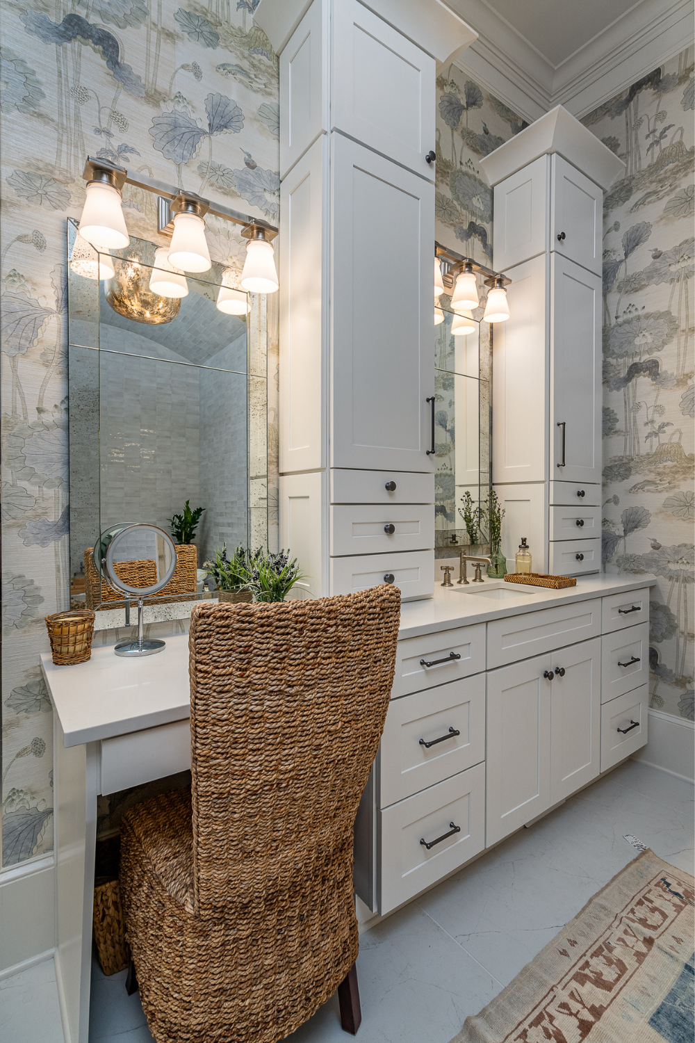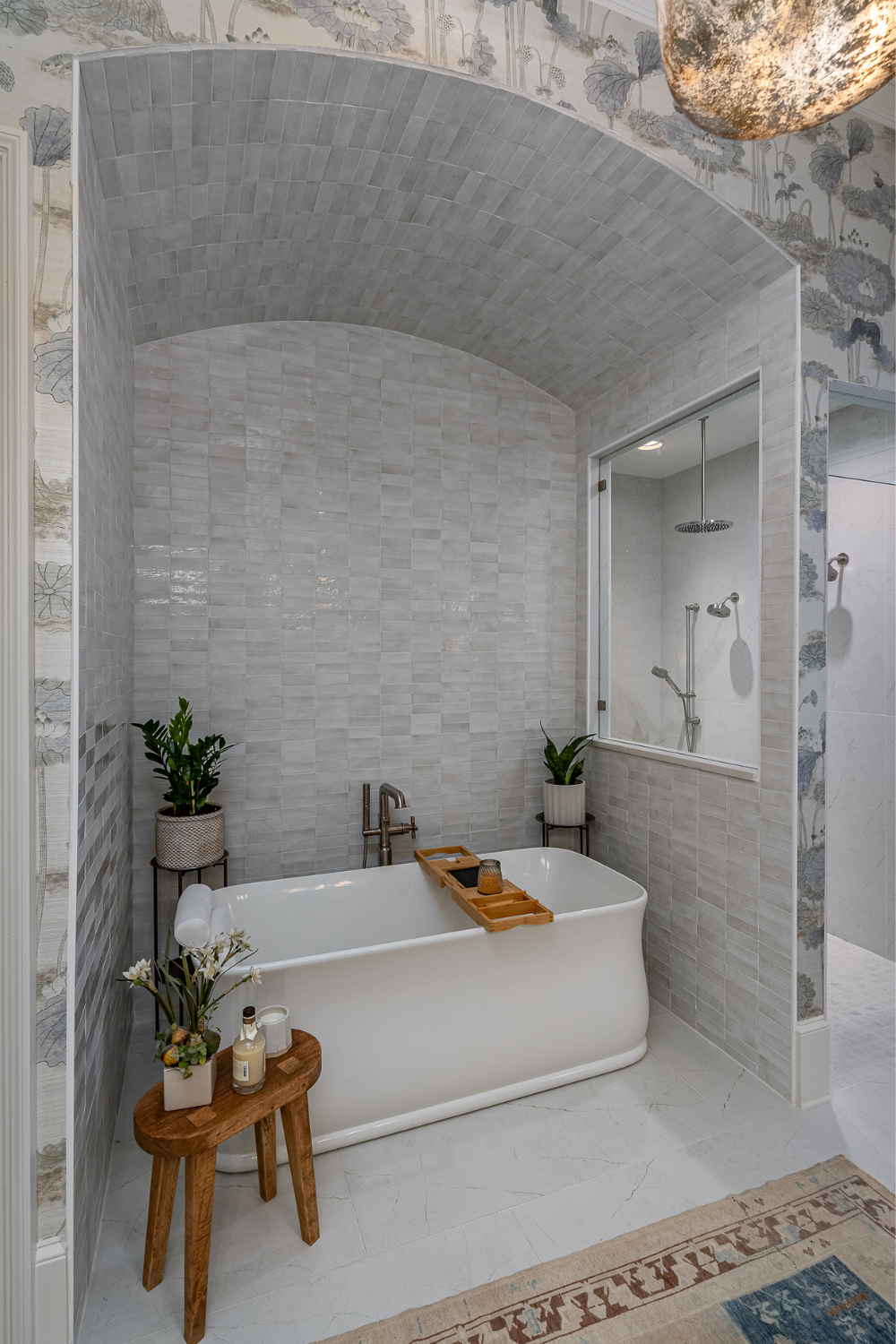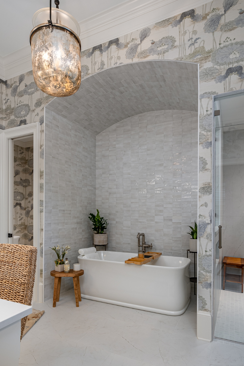 This was a collaborative project with Grace Brackman Design and JL Harrison Development. The client wanted a master bathroom remodel with a spacious zero-entry shower. They envisioned old-world charm with a modern twist. The bathroom’s focal point is a standalone tub enclosed by a beautifully tiled arched wall. Grace skillfully integrated an antique-inspired mirror and makeup vanity, infusing a vintage charm with a contemporary twist. Maintaining the timeless atmosphere, she enhanced the classical mood by incorporating blue coastal wallpaper and woven accents.