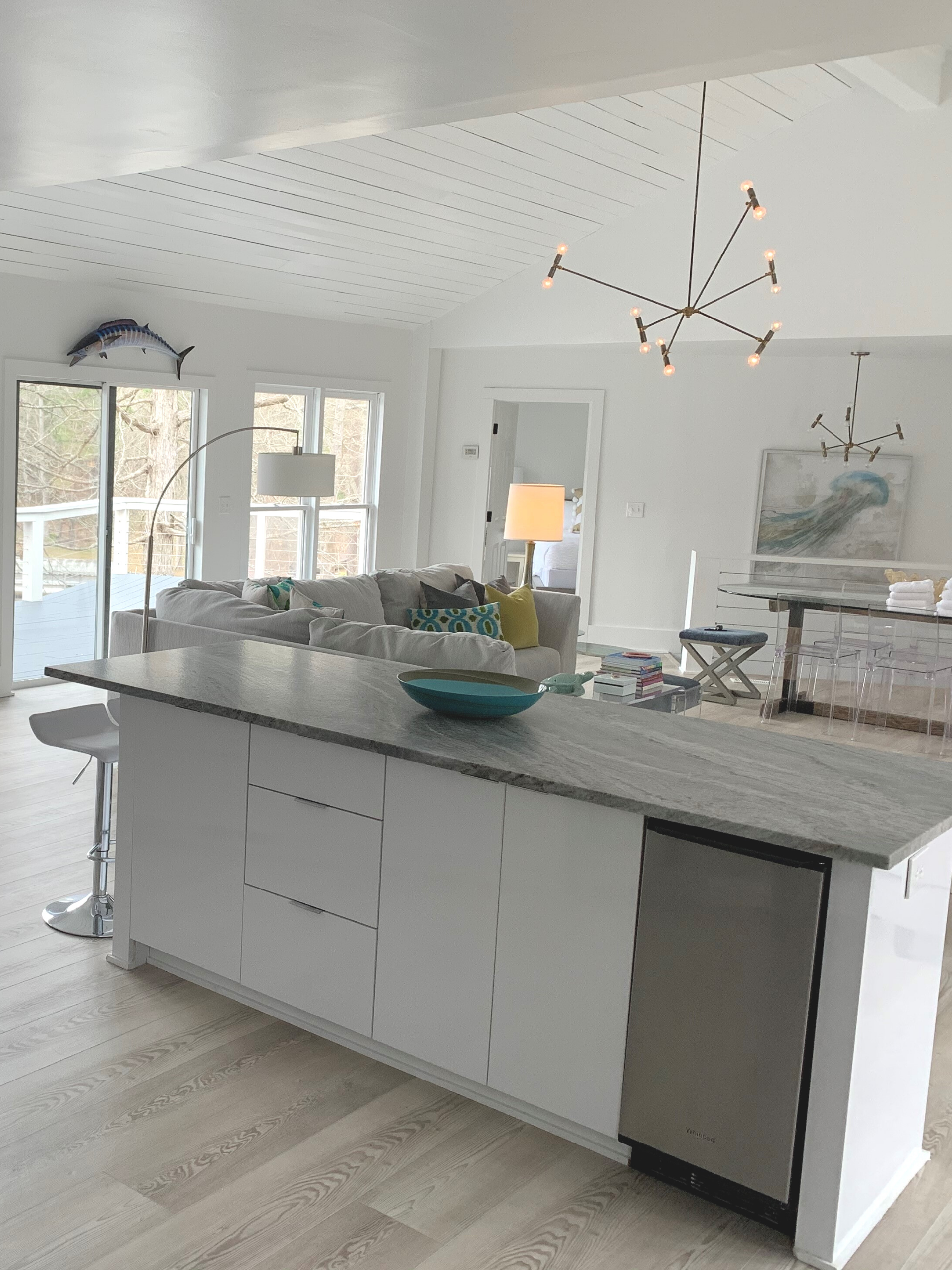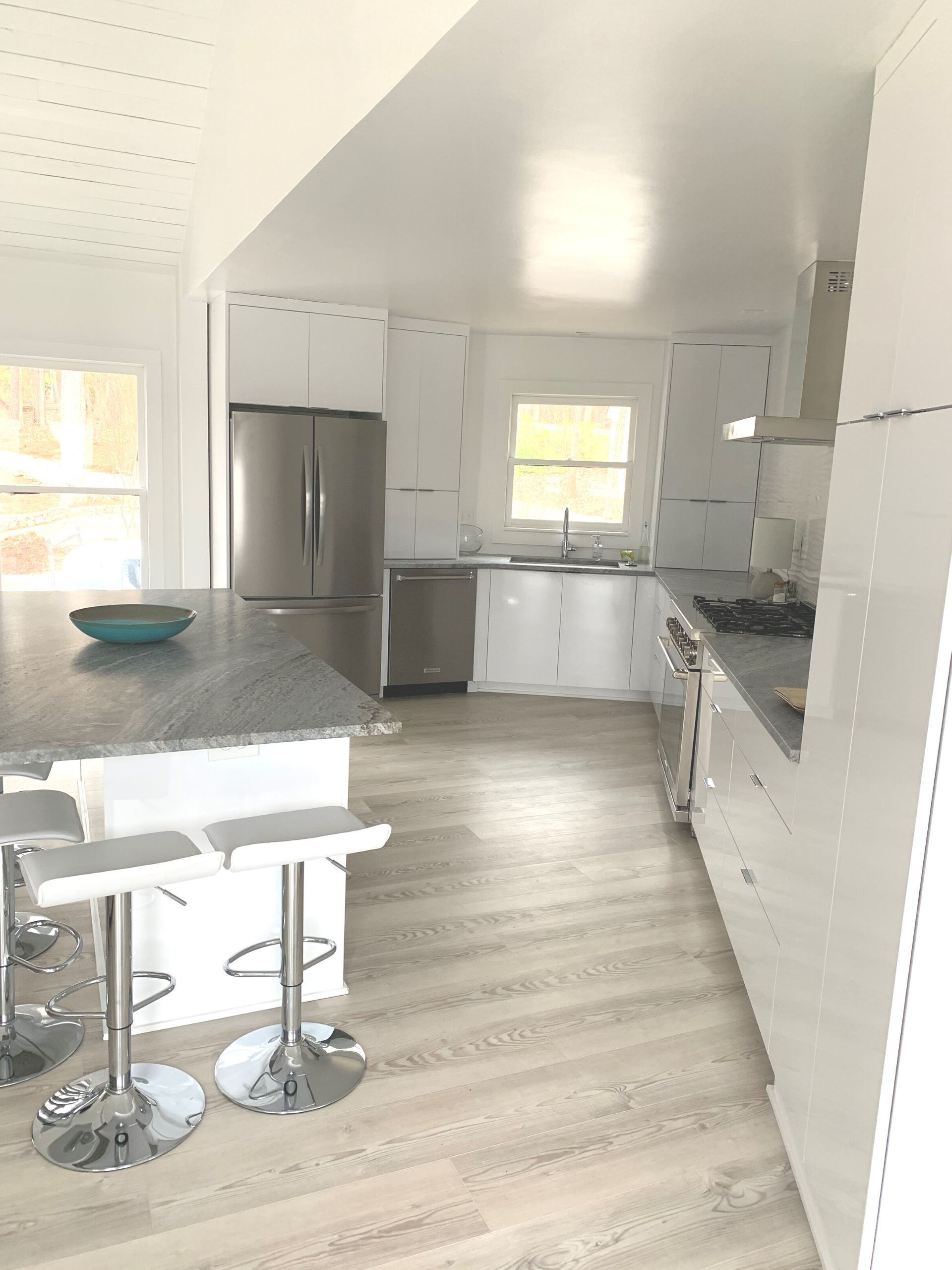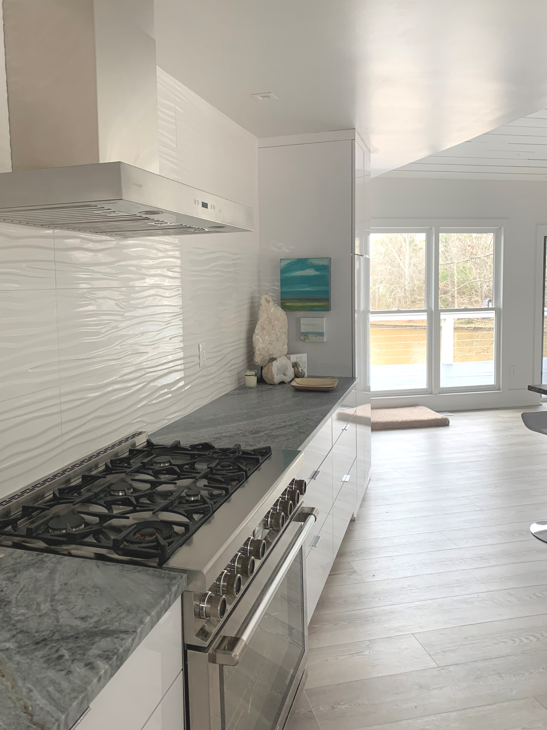 This kitchen was part of an entire home remodel. When the homeowner purchased the home, the main living area and kitchen had dark pine paneling with stained oak cabinetry and tile flooring. They wanted to make the space feel as large as possible by adding pops of color in their decor and by incorporating the greens and blues from the lake out back. These elements became the focal points. The homeowners opted for a clean minimalist style, so the ceilings, walls, and trim were painted a clean, crisp white. A sleek, high-gloss white acrylic cabinetry was installed, along with fun three-dimensional wave tile backsplash. By removing the tile and carpet from the living and kitchen areas and keeping the same vinyl plank throughout the main level, we created a cohesive, more spacious indoor atmosphere.