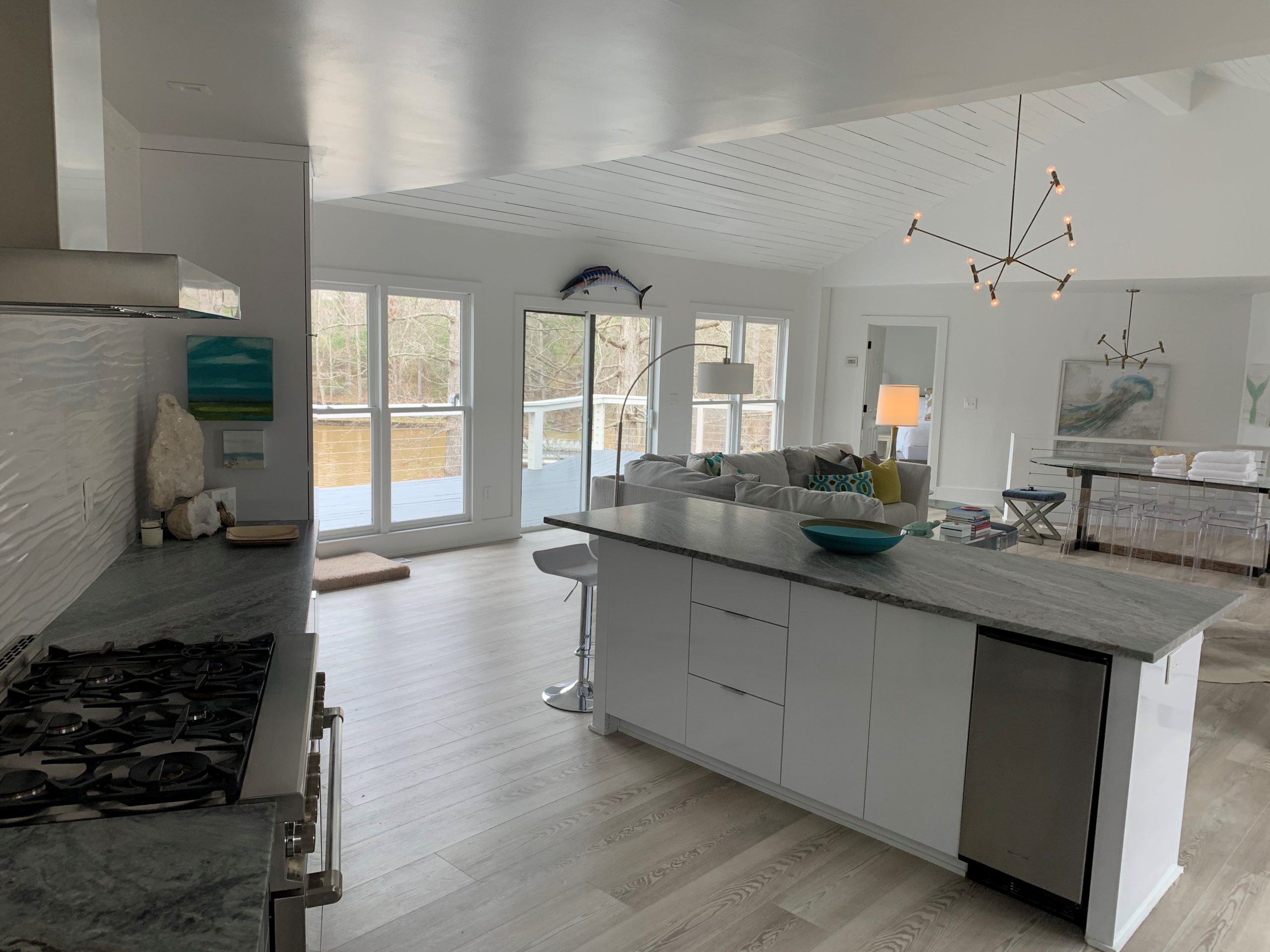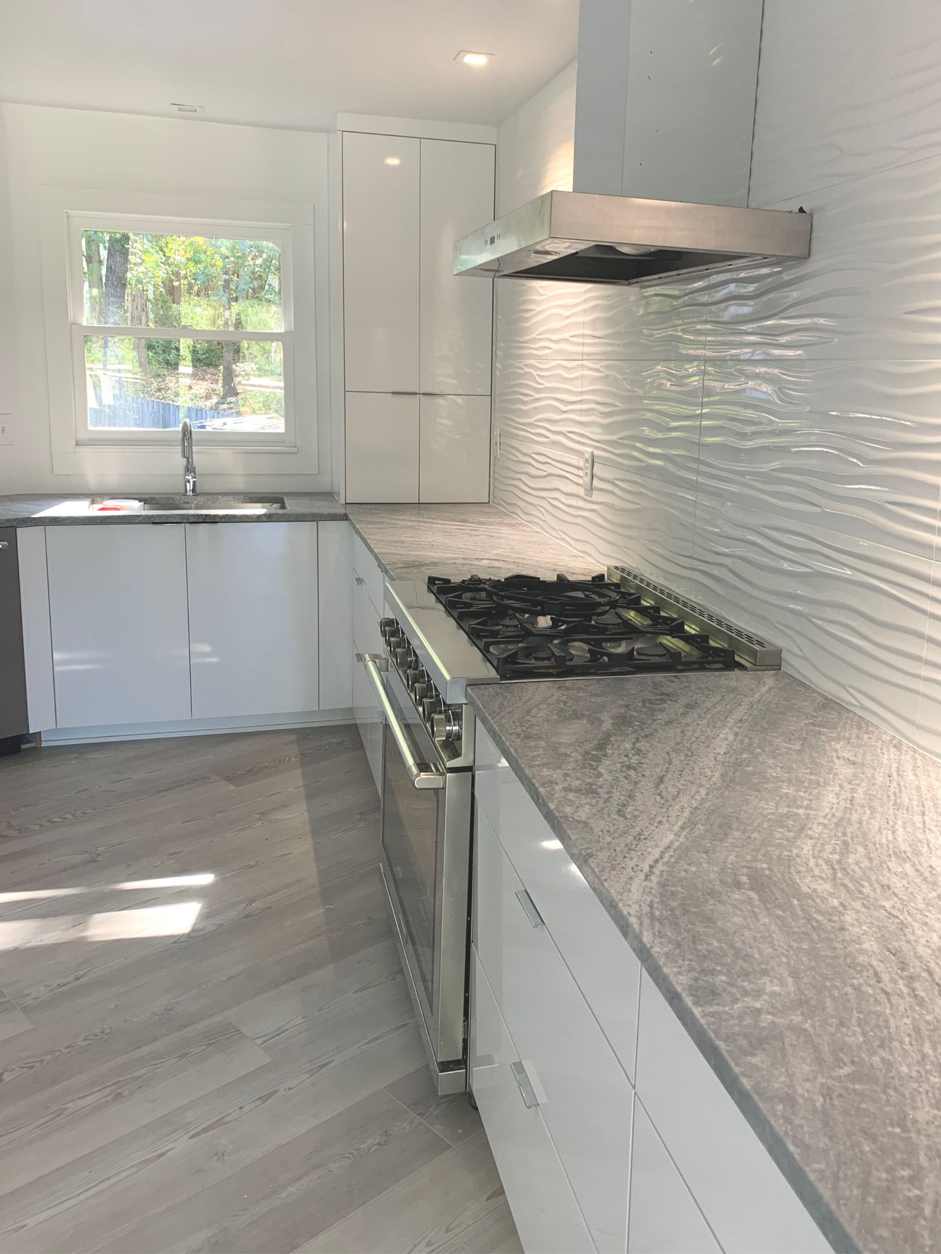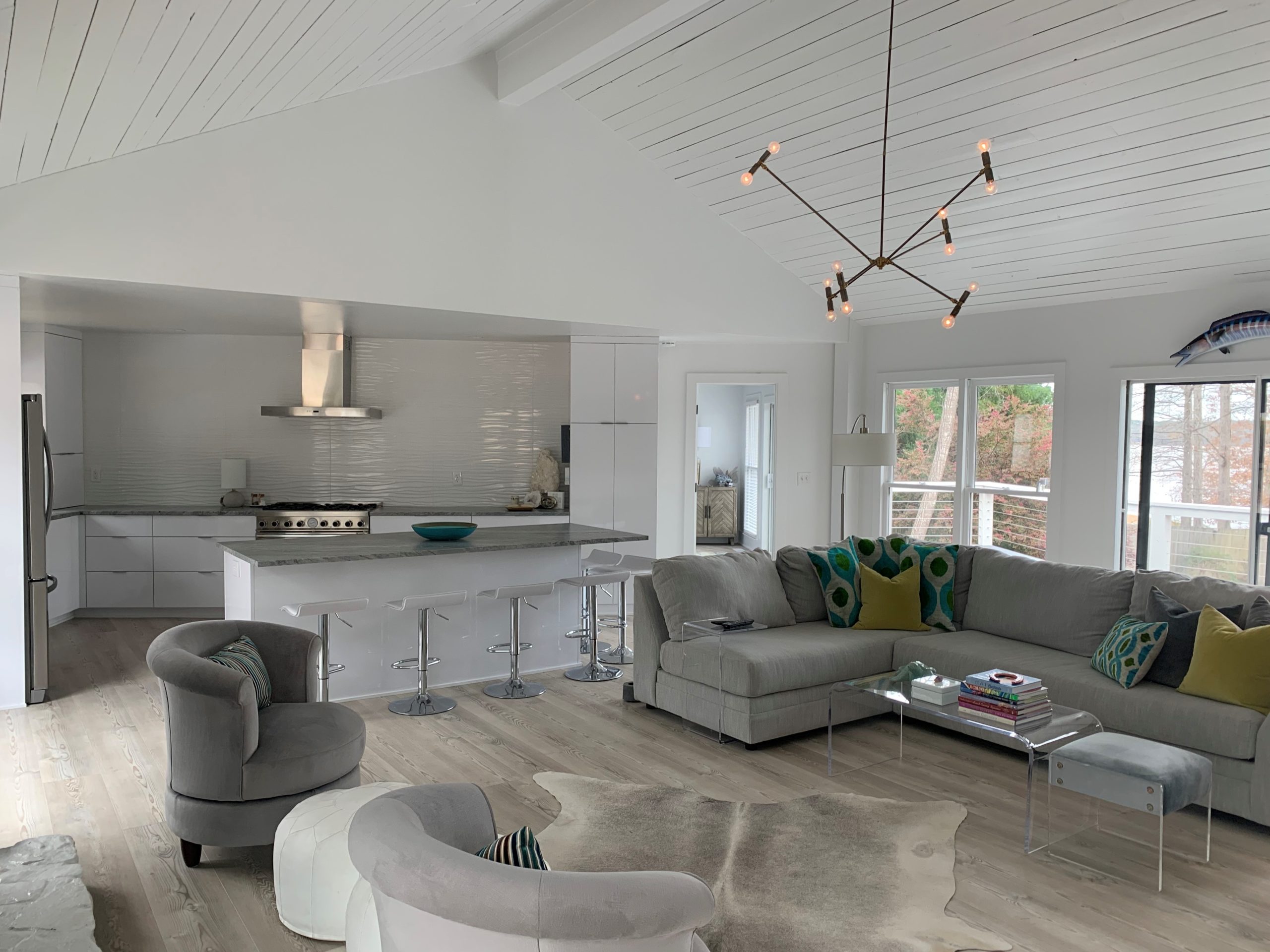 This kitchen was part of an entire home remodel. When the homeowner purchased the home, the main living area and kitchen had dark pine paneling with stained oak cabinetry and tile flooring. They wanted to make the space feel as large as possible by adding pops of color in their decor and by incorporating the greens and blues from the lake out back. These elements became the focal points. The homeowners opted for a clean minimalist style, so the ceilings, walls, and trim were painted a clean, crisp white. A sleek, high-gloss white acrylic cabinetry was installed, along with fun three-dimensional wave tile backsplash. By removing the tile and carpet from the living and kitchen areas and keeping the same vinyl plank throughout the main level, we created a cohesive, more spacious indoor atmosphere.