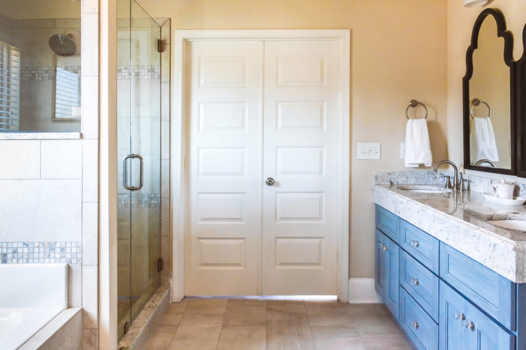 When our clients first began remodeling their master bathroom, they liked the general footprint of their current space, but desired a clean, light, spa-like atmosphere with material selections and design details. Keri noticed that natural light was coming from the window above the bathtub, but the surrounding shower walls blocked most of it. By adding a new window in the shower wall, light flooded into more areas of the entire space. This design decision, along with the addition of spa-blue cabinetry and natural stone elements, created the tranquil bathroom retreat that our clients were hoping for.
