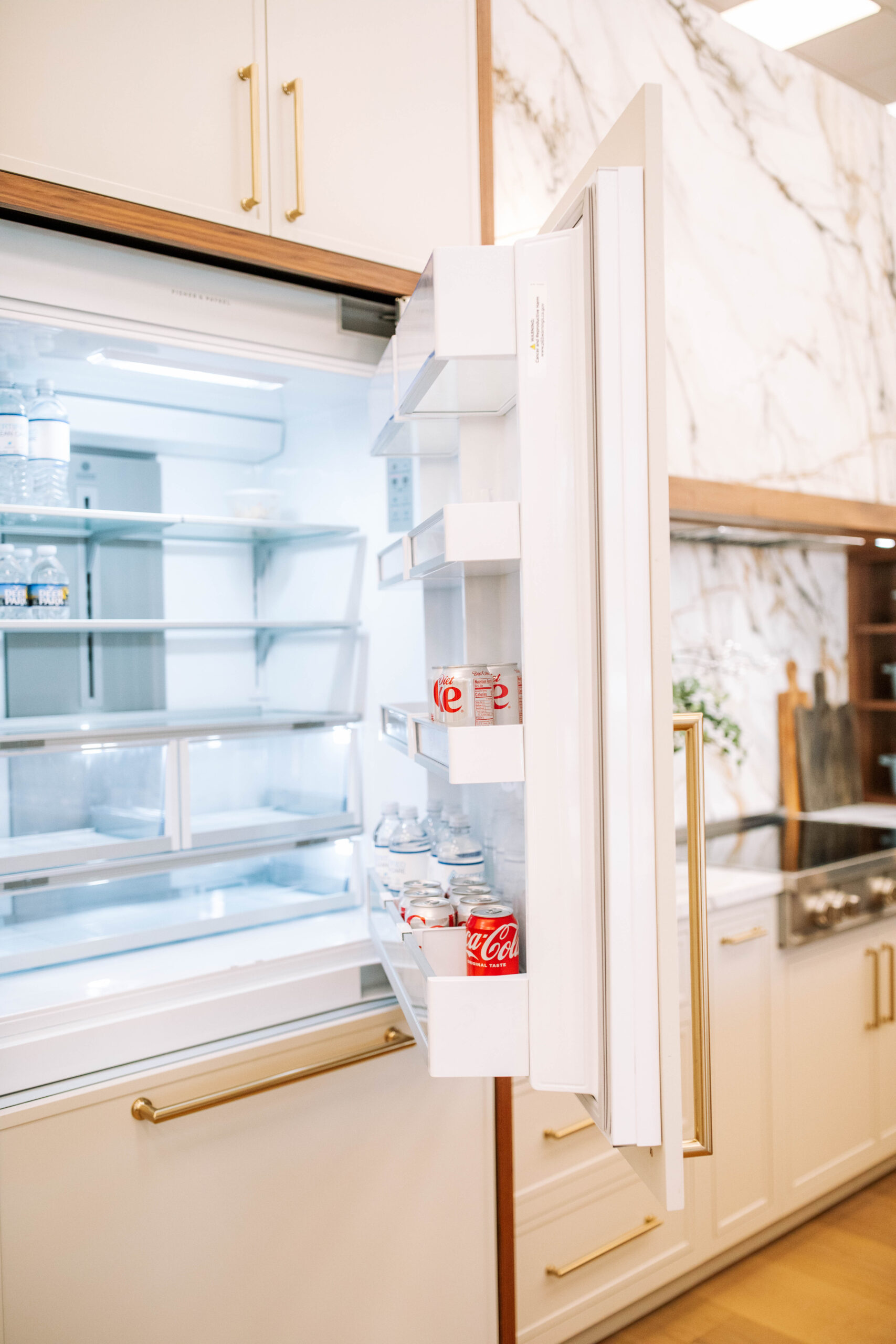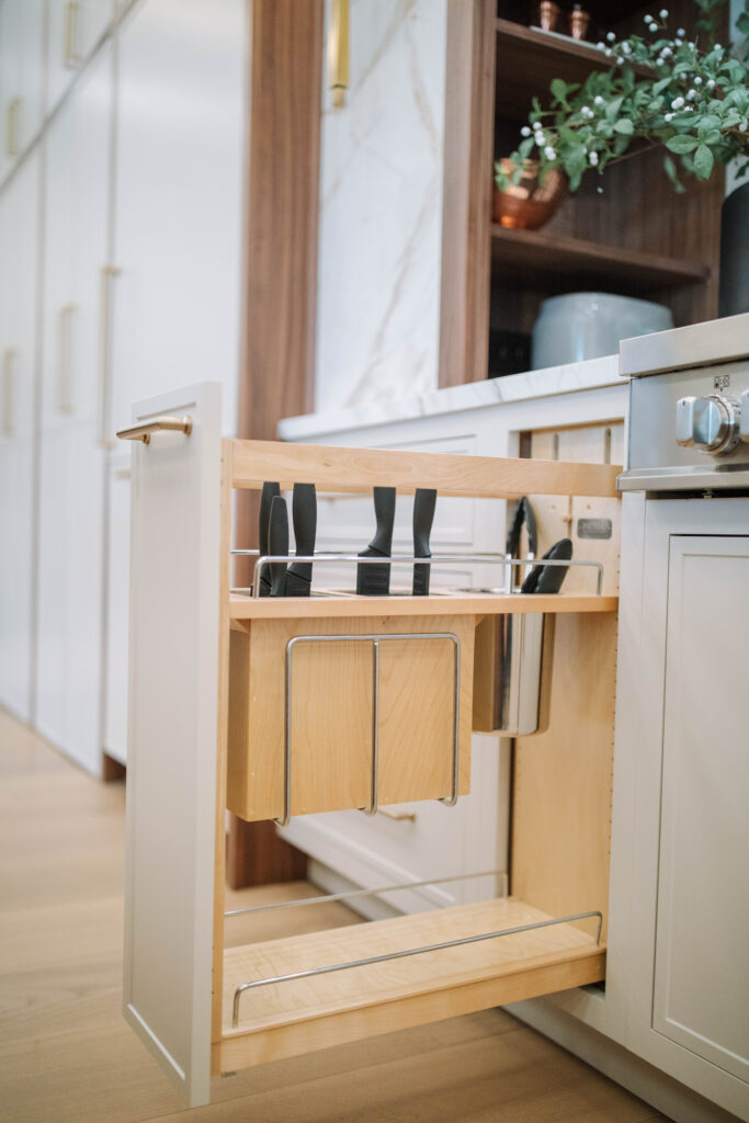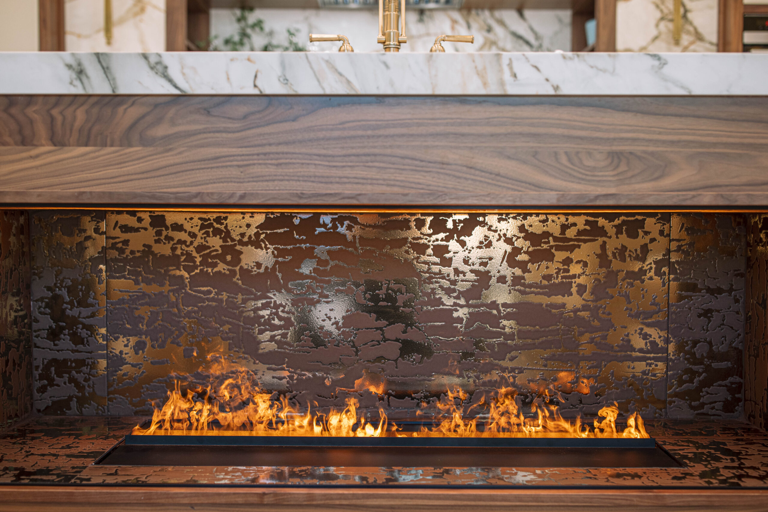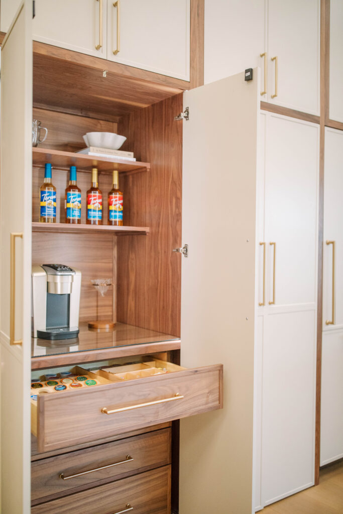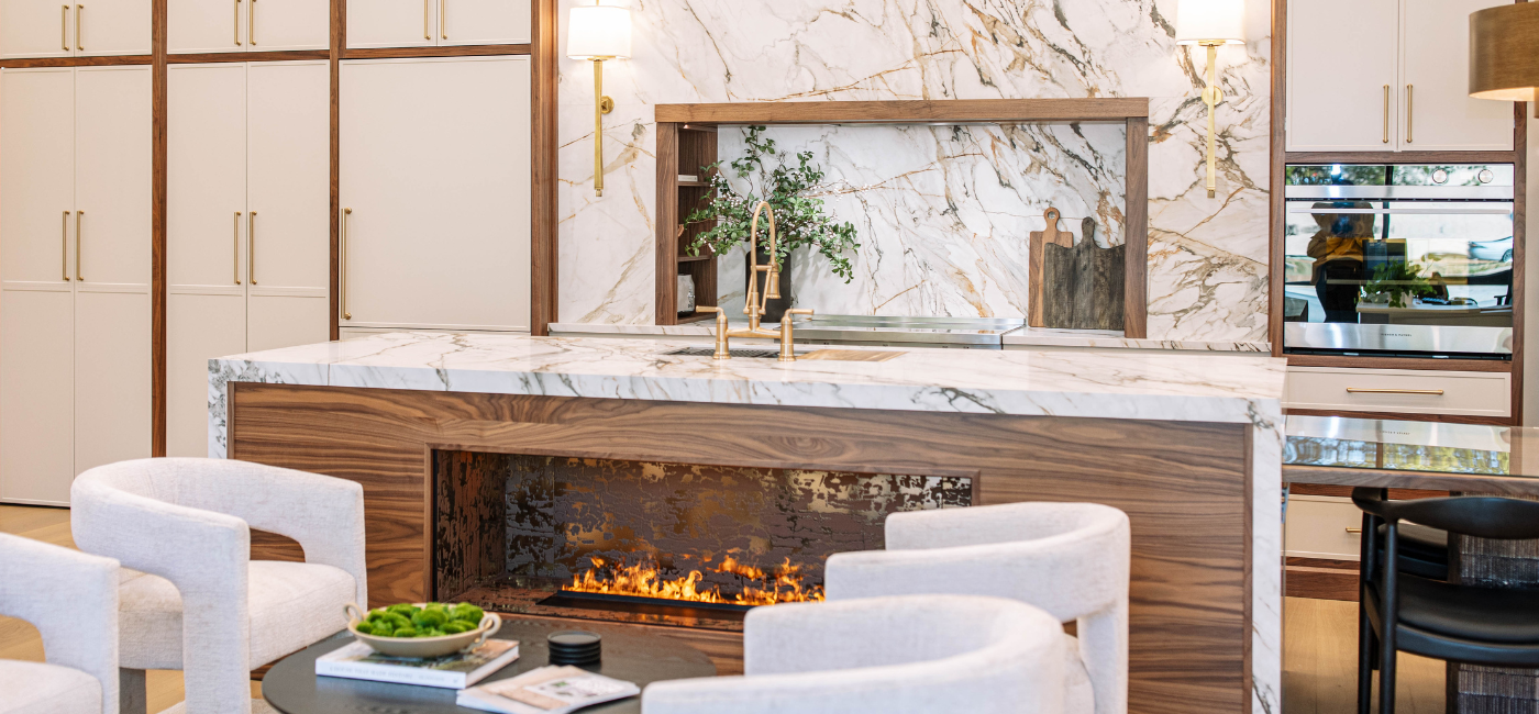 We envisioned a kitchen that felt both modern and timeless. To achieve this aesthetic, we took classic elements, including natural walnut, warm brass, and calacatta marble, and reimagined and reshaped them in a sleek, contemporary design. We implemented mixed finish cabinetry with slim shaker doors and dramatic marble veining — fresh concepts that captivate us. Since ensuring functionality is also key in any kitchen design, an array of organizers and pullouts were integrated into the cabinetry. Large porcelain slabs allow seamless integration with the surrounding design, spanning the entire surface area in the kitchen, as well as the backsplash and the front of the alcove range hood. Kitchens truly are the heart of the home and where everyone seems to land during gatherings. The layout of this kitchen fosters this sentiment with a custom dining table connected to the side of the island. Keeping the entire family in mind, including our four-legged companions, we incorporated a dedicated feeding station nestled at the end of the island. Lastly, to add a little wow factor and a touch of coziness, a water vapor fireplace was built into the back of the island, allowing a cohesive transition into the living area.