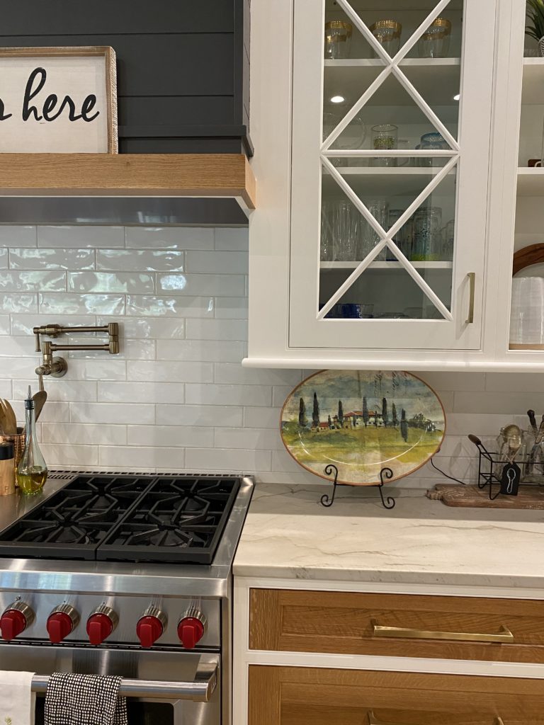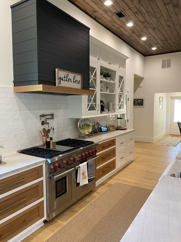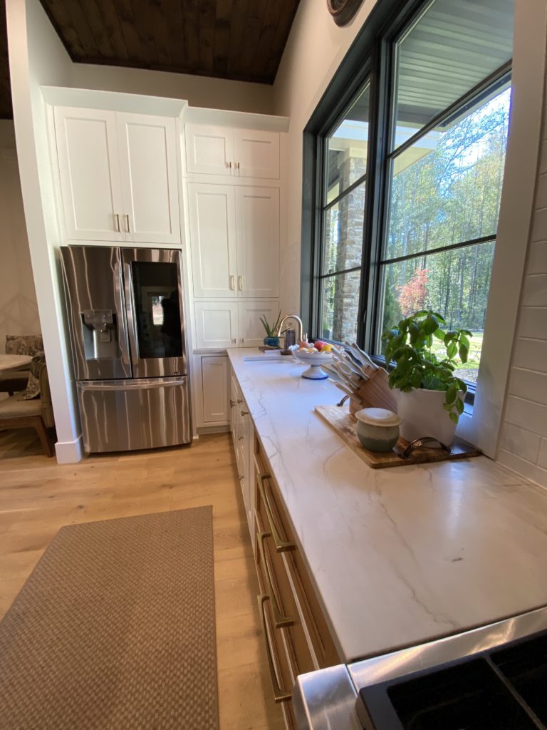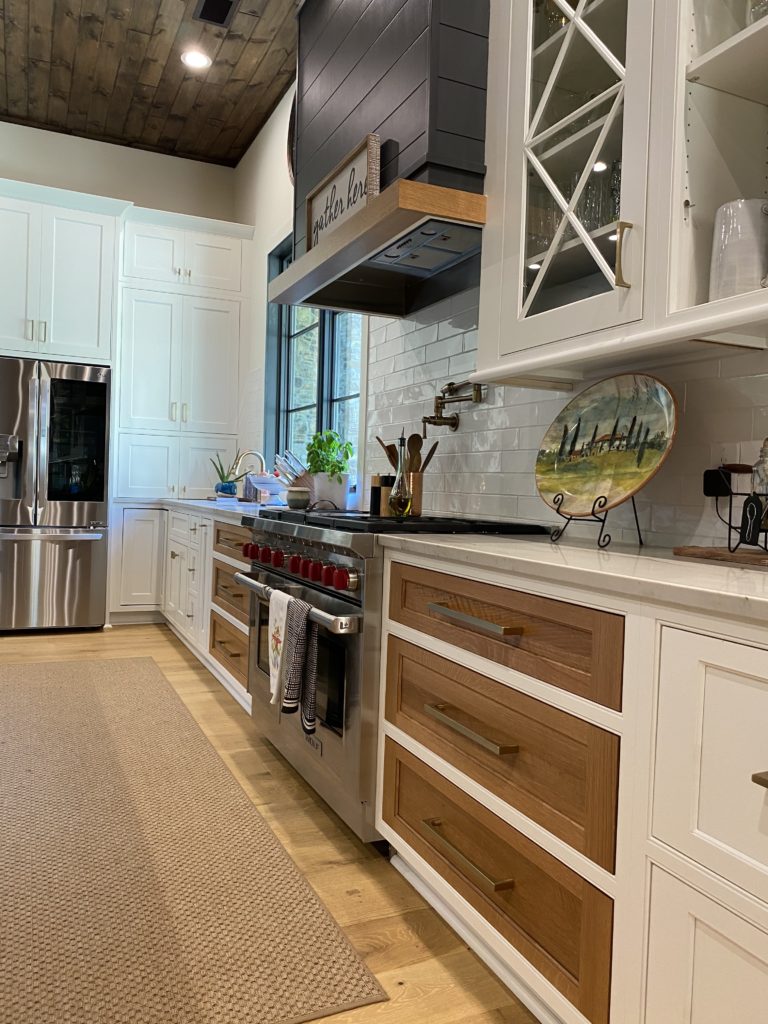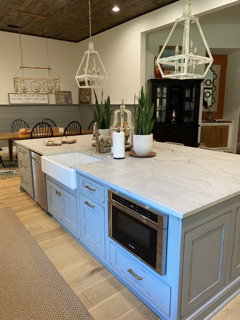 Along with the desire for an open-concept kitchen, their wishlist also included a large island that would serve both as a gathering place for meal-time prep, afterschool activities with their grandchildren, as well as a serving area for entertaining friends. For the overall aesthetic, our clients were inspired by a distressed cabinet finish on display in our Dalton Carpet Showroom, along with a photo they found of contrasting drawer fronts. This unique touch was only one of many, that Rosemary incorporated into the design, adding character and charm to the space.