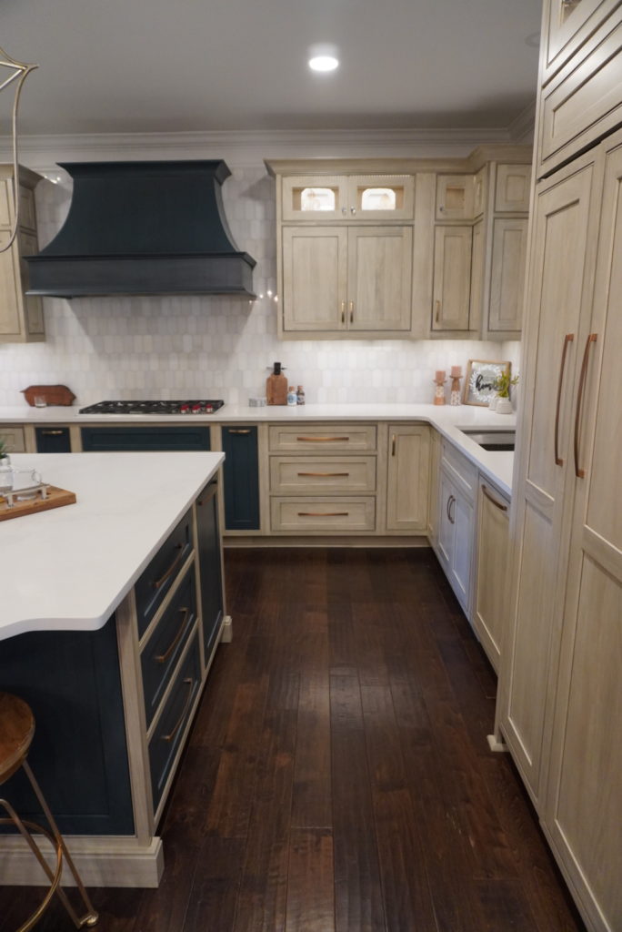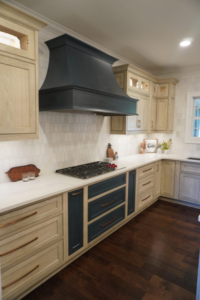 “I absolutely love the transformation of this kitchen. Removing the pantry closet and relocating the oven cabinet to be recessed in the wall made a much more functional and spacious layout of the kitchen which made a defined focal point wall with a beautiful custom wood hood as the star!”